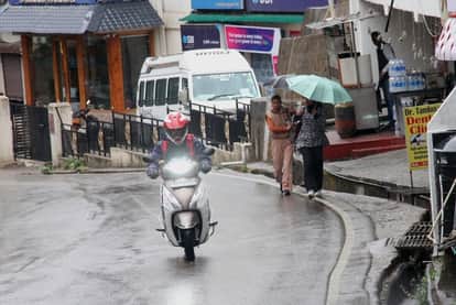 धर्मशाला में रविवार को बारिश के बीच गुजरते हुए दोपहिया चालक। अमर उजाला