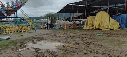 धर्मशाला। पूरा दिन बारिश के चलते बुधवार को धुम्मूशाह मेले के पहले दिन दाड़ी मैदान में कारोबारी उदासी की चादर में लिपटे नजर आए। दाड़ी मैदान में जहां हर साल 8 अप्रैल को रंग-बिरंगी दुकानों और झूलों की कतारें लगती थीं, इस बार कीचड़ और पानी से भरा पड़ा है।