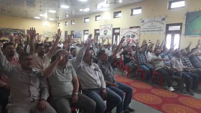 धर्मशाला में एचआरटीसी ड्राइवर यूनियन की बैठक की अध्यक्षता करते हुए प्रांतीय प्रधान मान सिंह ठाक