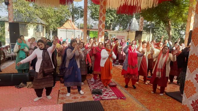 स्वस्थानी माता मंदिर रक्कड़ पंजपीरी में कथा के दौरान झूमतीं महिलाएं। -स्रोत : जागरूक पाठक