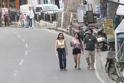 धर्मशाला में सोमवार को गर्म मौसम में चहलकदमी करते पर्यटक। -अमर उजाला