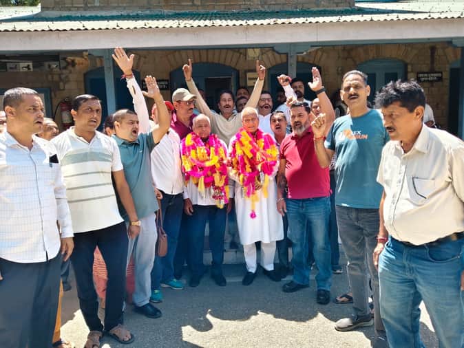 ज्वाली के नवनियुक्त ब्लॉक कांग्रेस अध्यक्ष चैन सिंह गुलेरिया का स्वागत करते कृषि मंत्री चंद्र क