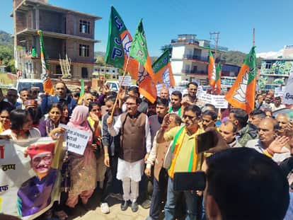 धीरा में प्रदेश सरकार के खिलाफ जन आक्रोश रैली निकालते हुए विधायक विपिन परमार और कार्यकर्ता। स्