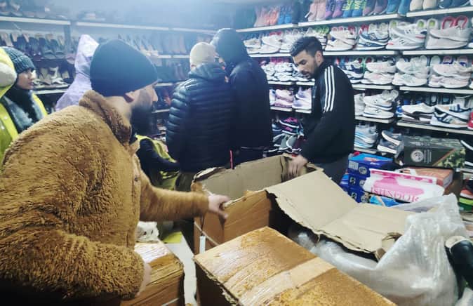 मनु मार्केट मनाली में बर्फबारी के दौरान गर्म जूतों की खरीदारी करते पर्यटक। संवाद