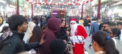 मनाली माल रोड़ पर सांता के साथ फोटो खिचवाते हुए पर्यटक। संवाद