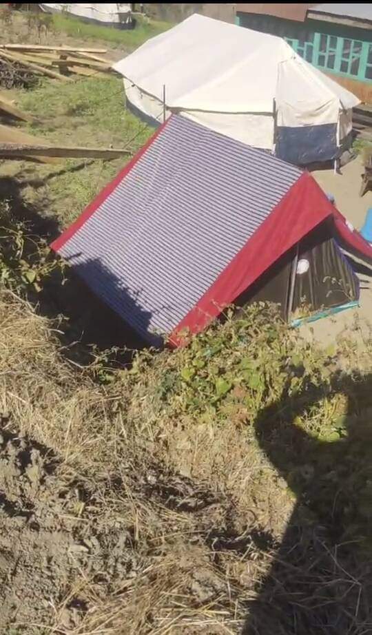 बंजार के झनियार में आग लगने से जले मकान के बाद टेटों में रहने को मजबूर प्रभावित।-संवाद