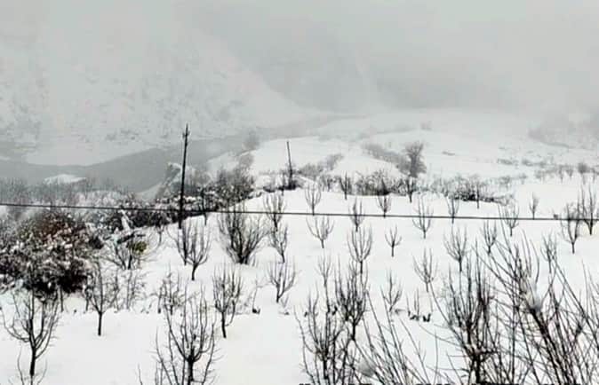 लाहौल में बर्फबारी के बाद ढके सेब के बगीचे।-संवाद