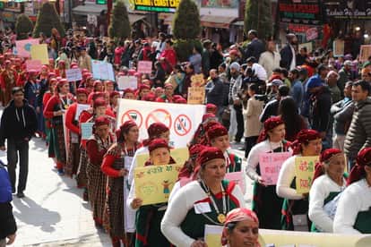 मनाली विंटर कार्निवल के दौरान झांकी में भाग लेती महिला मंडल सदस्य