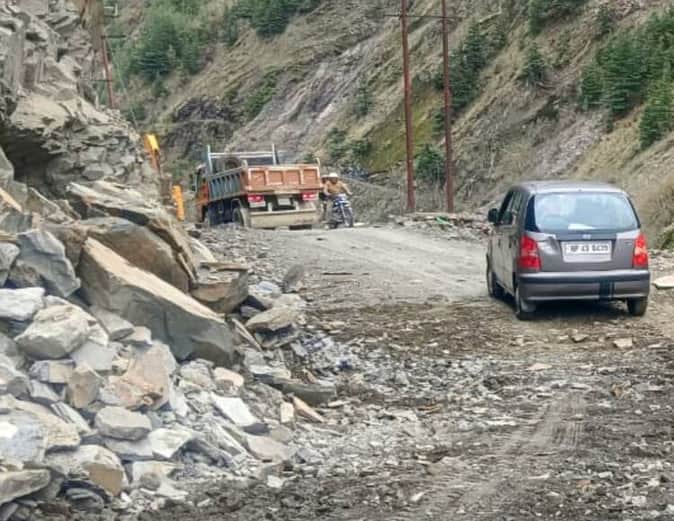 लाहौल में संसारी - किलाड- तांदी मार्ग को बहाल करने के बाद गुजरते वाहन।-संवाद