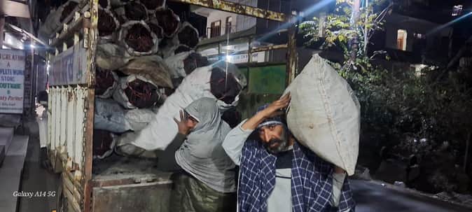 जोगिंद्रनगर में पहुंची कोयले की खेप को गोदाम तक ले जाते कामगार। स्त्रोत- जागरूक पाठक
