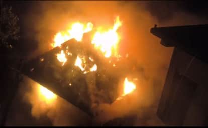 सरकाघाट के तहत भरनाल गांव में रविवार रात आकाशीय बिजली गिरने से धूं धूं कर जलती गोशाला।
