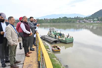 सुंदरनगर में ब्यास सतलुज लिंक परियोजना के जलाशय का निरीक्षण करते राज्यपाल कविंद्र गुप्ता। साथ म