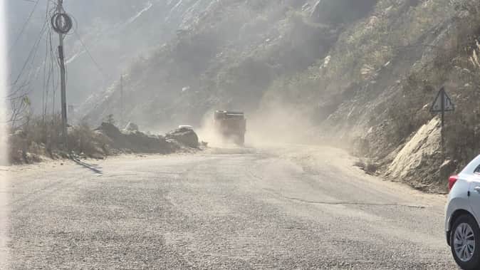 पंडोह में नौ मील के पास स्लाइडिंग प्वाइंट के निकट वाहन दौड़ने से उड़ती धूल। संवाद