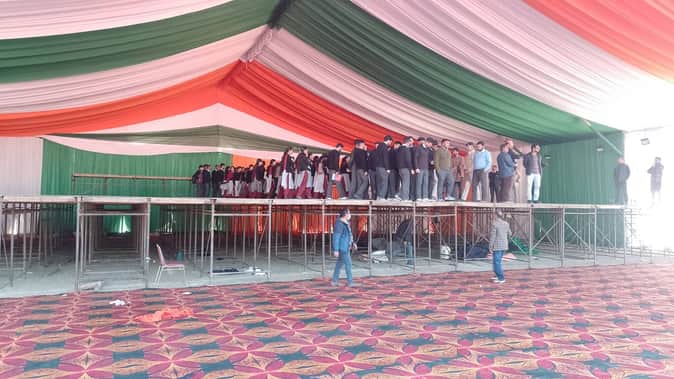 पड्डल मैदान मंडी में आयोजित होने वाले जन संकल्प सम्मेलन के लिए बनाए गए मंच पर चढ़ कर मजबूती जां
