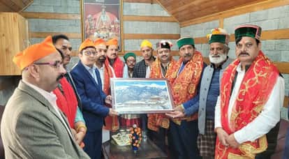 सराहन पहुंचे उप मुख्यमंत्री को मां भीमाकाली मंदिर की तस्वीर भेंट करते एसडीएम रामपुर। संवाद
