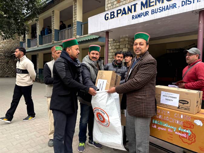 रामपुर कॉलेज में जरूरतमंद लोगों की सहायता के लिए समान इकठ्ठा करते अध्यापक। स्रोत: कालेज प्रबंधन