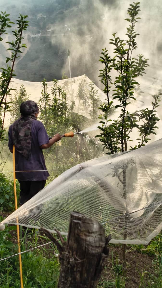 सेब के बगीचों में सुंडी को नियंत्रित करने के लिए कीटनाशक की स्प्रे करते बागवान। संवाद