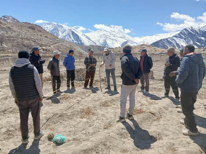 किन्नौर के मलिंग गांव में आयोजित शिविर के दौरान बागवानों को सेब के पौधरोपण बारे प्रशिक्षित करते