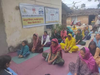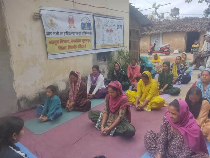 आयुष विभाग के खंड सूरजपुर के तहत शिविर में योग क्रियाएं करते ग्रामीण। स्रोत : विभाग