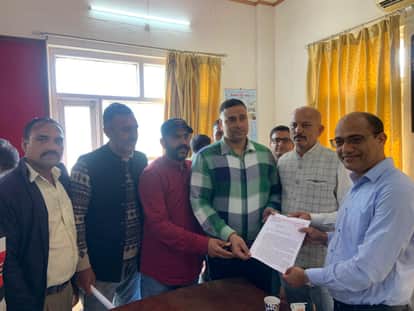 रेणुकाजी बांध प्रबंधन के अधिकारी को ज्ञापन सौंपते रेणुका बांध विस्थापित संघर्ष समिति के सदस्य।