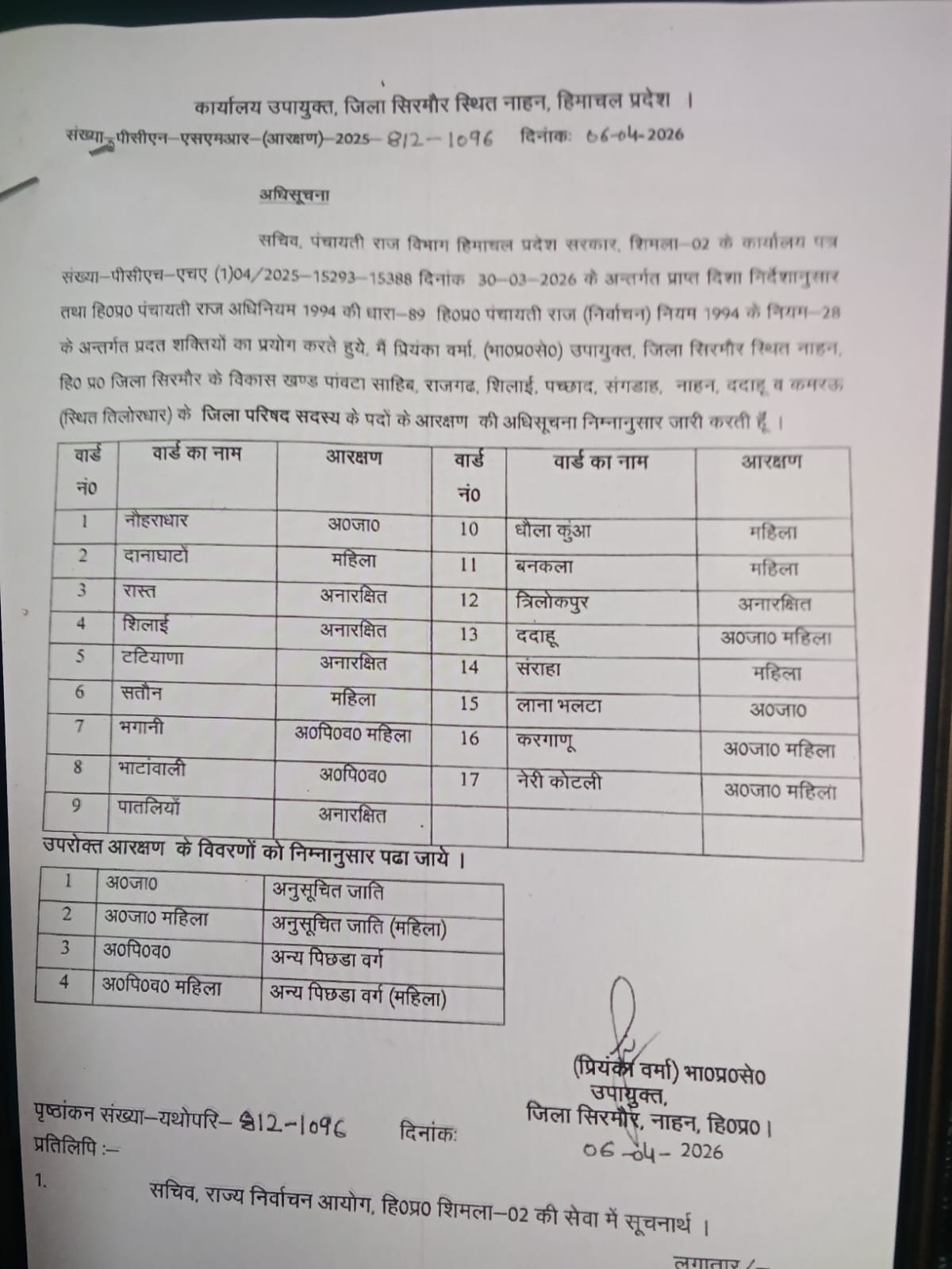 उपायुक्त प्रियंका वर्मा ने सिरमौर जिला सिरमौर में 8 विकास खंडों के प्रधान पद के लिए आरक्षण का नया रोस्टर जारी कर दिया है।