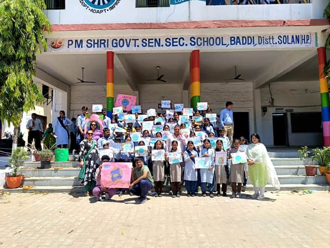 बद्दी स्कूल में पृथ्वी दिवस पर चित्रकला प्रतियोगिता में भाग लेने वाले छात्र प्रधानाचार्य के साथ