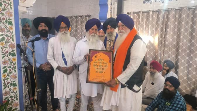 ढांग टपरियां में ज्ञानी अवतार सिंह को विशेष सम्मान देकर सम्मानित करते ट्रस्ट के सदस्य।– स्रोत