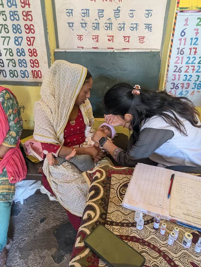 बद्दी के चक्कां गांव में आयोजित स्वास्थ्य जांच शिविर में बच्चे की जांच करते हुए स्वास्थ्य कार्य