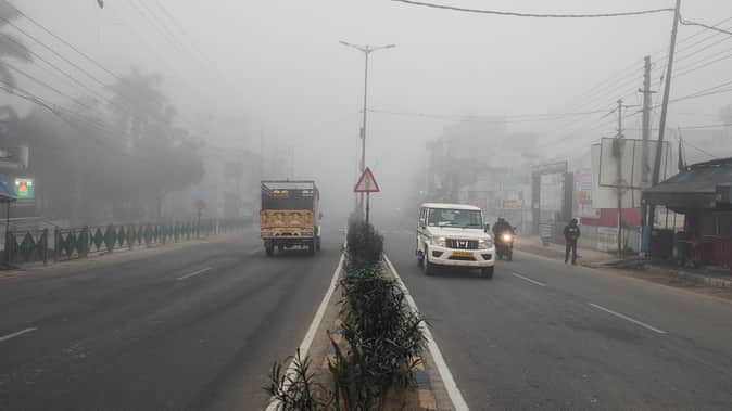 ऊना में सुबह के समय घने कोहरे के बीच रेंगते वाहन।संवाद