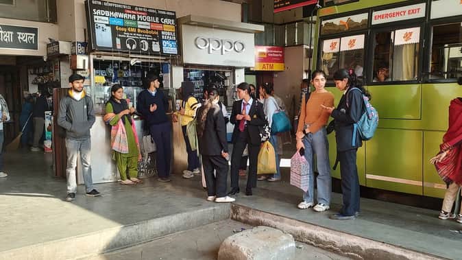 ऊना में बसें रूट पर न चलने के कारण बस स्टेंड़ में इंतजार करते विद्यार्थी । संवाद