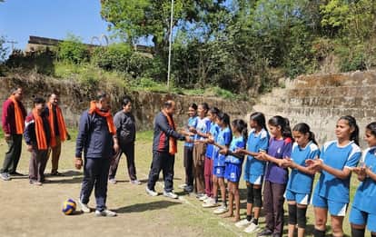 साई अस्मिता खेलो इंडिया वॉलीबॉल सिटी लीग में खिलाड़ियों से परिचय करते मुख्यतिथि ।स्रोत आयो