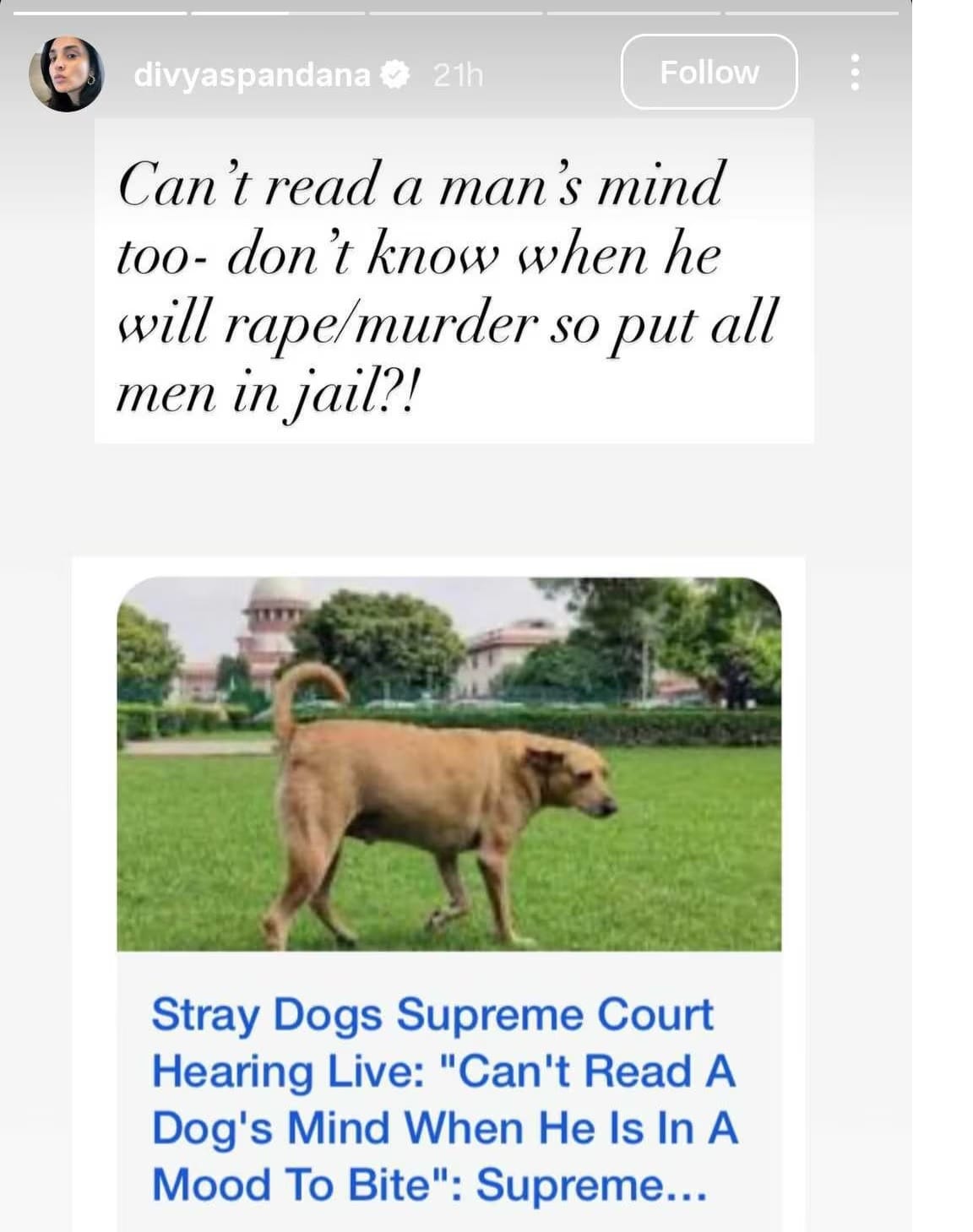 अभिनेत्री और नेता दिव्या स्पंदना (जिन्हें राम्या के नाम से भी जाना जाता है) ने आवारा कुत्तों के मामले में सुप्रीम कोर्ट की सुनवाई पर तीखी टिप्पणी की है। उन्होंने कुत्तों के मूड को लेकर शीर्ष कोर्ट की टिप्पणी की तुलना पुरुषों से की।सुप्रीम कोर्ट ने बुधवार को कहा कि किसी कुत्ते का मूड पता लगाना संभव नहीं है। कोर्ट उन लोगों की दलीलों के जवाब में टिप्पणी की, जिन्होंने सड़क पर आवारा कुत्तों की समस्या को लेकर शीर्ष कोर्ट के आदेश को चुनौती दी थी और कहा था कि जानवरों के साथ सहानुभूति रखने से हमलों को रोका जा सकता है।