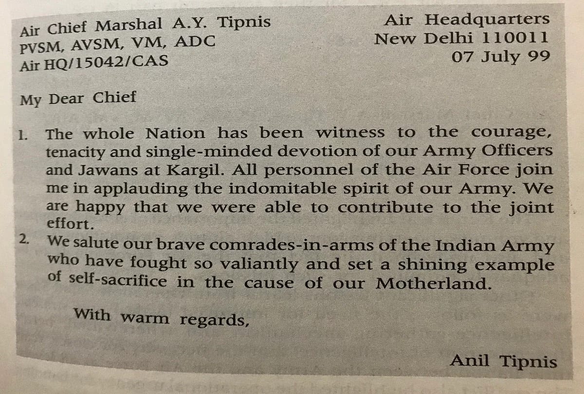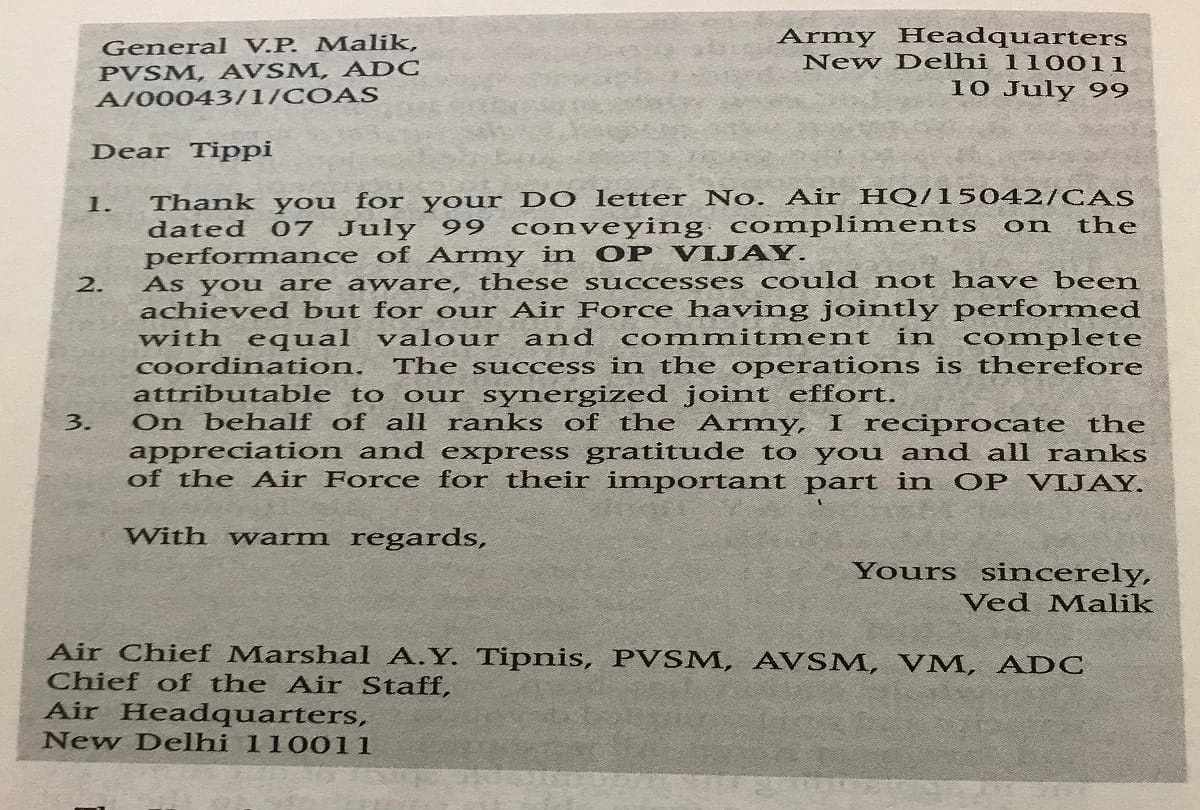 कारगिल की लड़ाई जीतने के बाद वायुसेना प्रमुख अनिल यशवंत टिपनिस ने 7 जुलाई 1999 को थलसेना प्रमुख जन. वीपी मलिक को पत्र लिखा था। इसमें उन्होंने मलिक को 'माय डियर चीफ' कह कर संबोधित किया। पूरा देश कारगिल में हमारे आर्मी अफसरों और जवानों की बहादुरी, तप और उनकी एकचित्त भक्ति का गवाह है। भारतीय वायुसेना के समस्त अधिकारियों और जवानों की तरफ से हमारी सेना की अदम्य भावना की सराहना करते हैं। हमें इस बात की खुशी है कि हम भी इस संयुक्त प्रयास में अपना योगदान देने के काबिल रहे। हम भारतीय सेना के उन बहादुरों को सेल्यूट करते हैं, जिन्होंने अपनी मातृभूमि की रक्षा के लिए आत्म त्याग का चमकता हुआ उदाहरण पेश किया है। तत्कालीन सेनाध्यक्ष जन. वीपी मलिक ने अपनी किताब 'फ्रॉम सरप्राइज टू विक्टरी' में पत्राचार का हवाला दिया है।