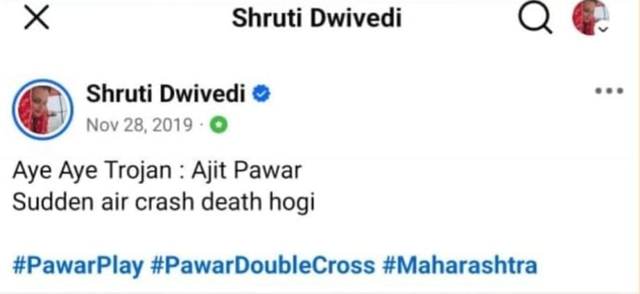श्रुति द्विवेदी ने कहा कि, लेकिन अजित पवार की चन्द्र राशि में राहु केतु की जो स्थिति थी, वह इसी तरह के किसी बड़े हादसे की संभावना व्यक्त करता था। अजित पवार की महादशा भी शुभ संकेत नहीं दे रही थी। इन संकेतों में यह छिपा हुआ था कि अच्छा समय चलने के बाद भी कुछ समय के बाद अजित पवार का समय जल्द ही एक बार फिर पलटेगा और उन्हें इसका नुकसान उठाना पड़ सकता है। उन्होंने कहा कि आज जो दुर्भाग्यपूर्ण हादसा हुआ है, वह इन्हीं ग्रहों नक्षत्रों की असर का परिणाम है।