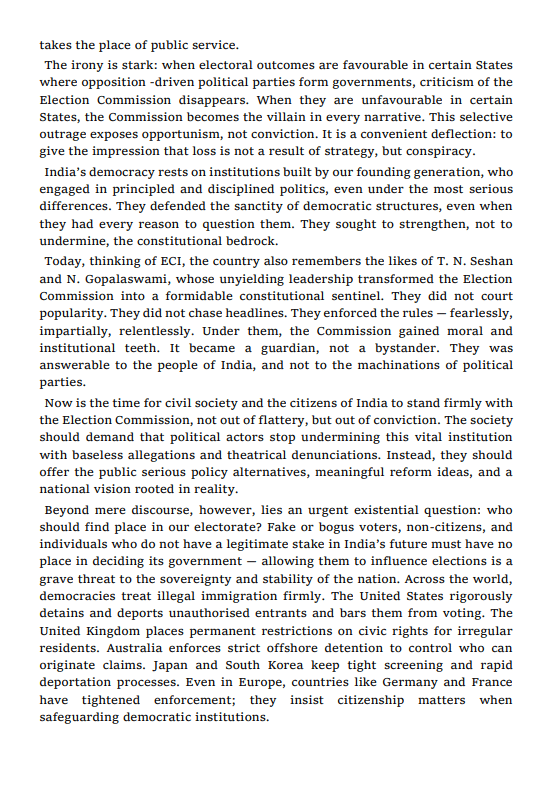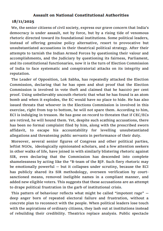 इस पत्र में आरोप लगाया गया है कि सैन्य बलों, न्यायपालिका और संसद पर सवाल उठाने के बाद अब चुनाव आयोग को निशाना बनाया जा रहा है। वरिष्ठ नागरिकों ने लिखा कि विपक्ष के नेता राहुल गांधी ने बार-बार चुनाव आयोग पर वोट चोरी में शामिल होने का आरोप लगाया, 'परमाणु बम' जैसी भाषा इस्तेमाल की और यहां तक कहा कि आयोग देशद्रोह कर रहा है, लेकिन इन दावों के समर्थन में कोई औपचारिक शिकायत या शपथ पत्र नहीं दिया।