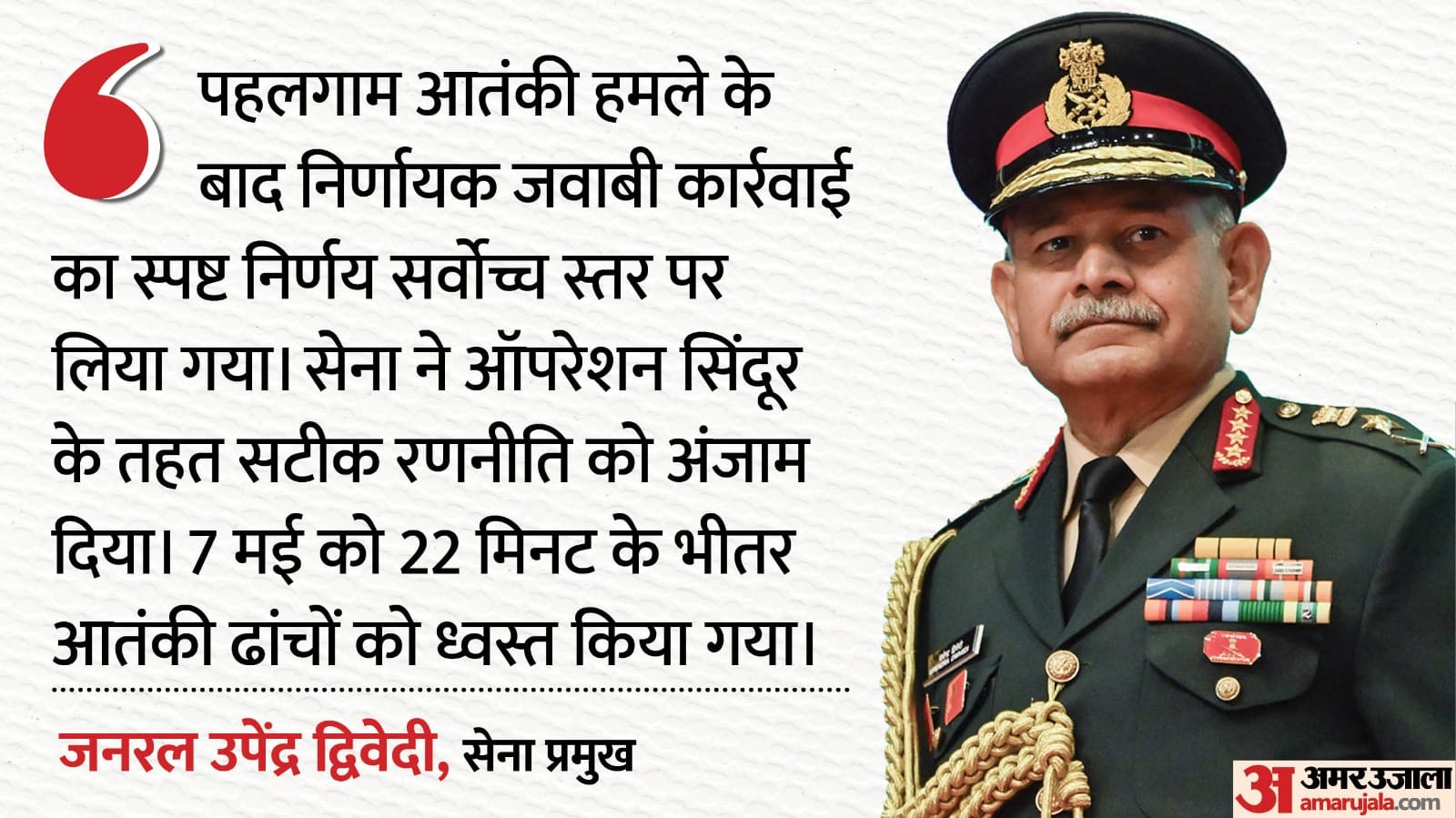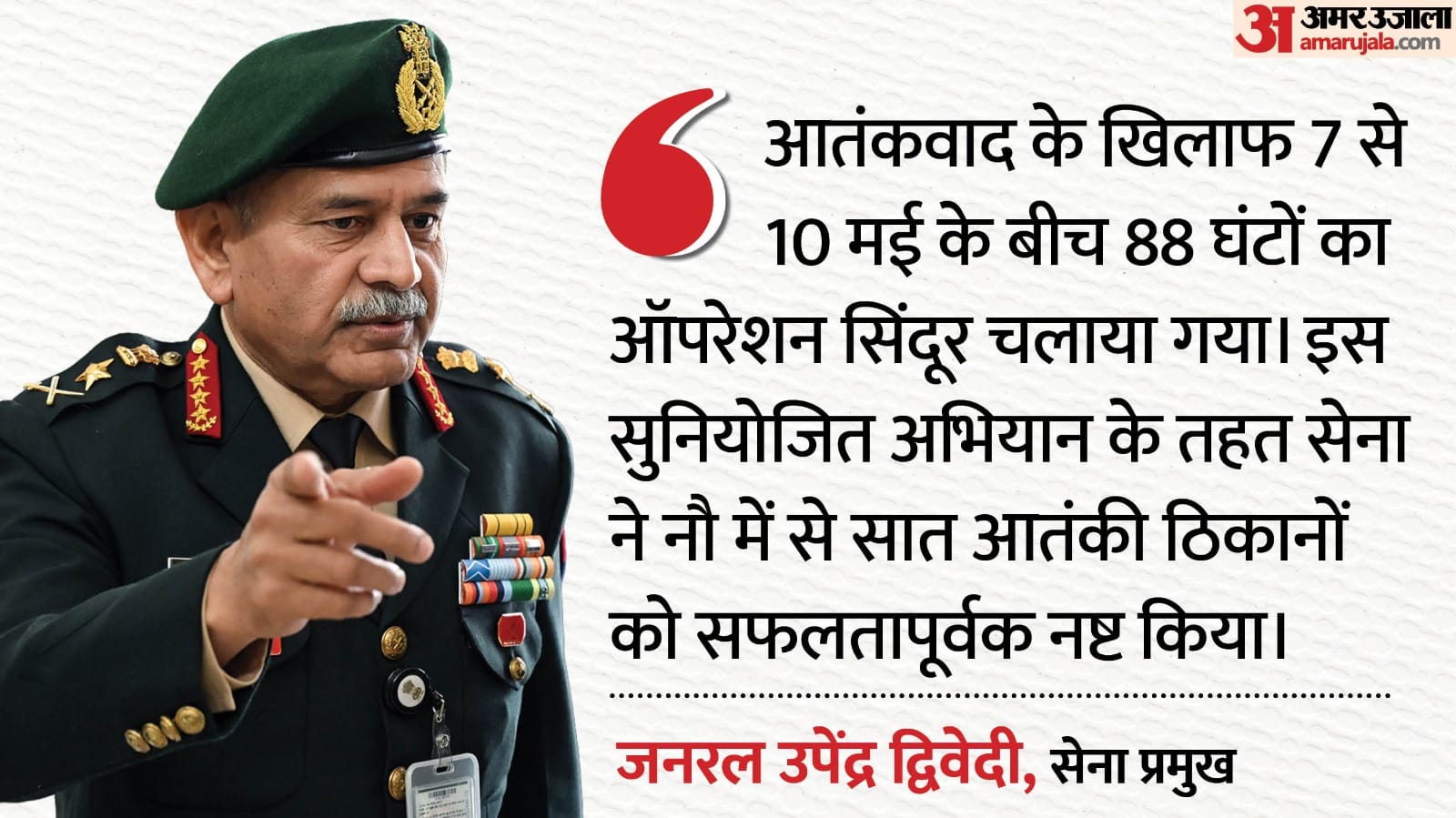 उन्होंने कहा कि पहलगाम आतंकी हमले के बाद निर्णायक जवाबी कार्रवाई का स्पष्ट निर्णय सर्वोच्च स्तर पर लिया गया। सेना ने ऑपरेशन सिंदूर के तहत सटीक रणनीति को अंजाम दिया। 7 मई को 22 मिनट के भीतर आतंकी ढांचों को ध्वस्त किया गया। बकौल सेना प्रमुख जनरल द्विवेदी, 'आतंकवाद के खिलाफ 7-10 मई के बीच 88 घंटों का ऑपरेशन सिंदूर चलाया गया। इस सुनियोजित अभियान के तहत सेना ने नौ में से सात आतंकी ठिकानों को सफलतापूर्वक नष्ट किया। '
