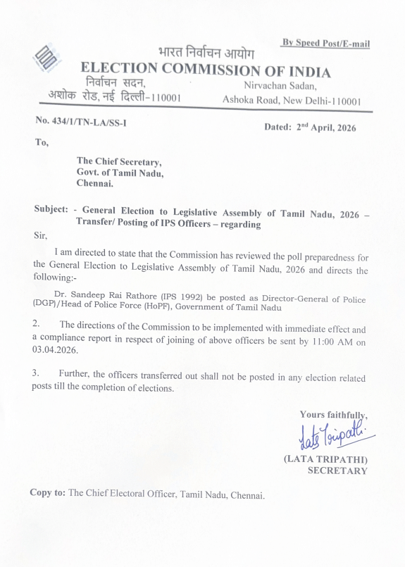 निर्वाचन आयोग ने आज राज्य में चुनाव की तैयारियों के तहत जी. वेंकटरमन के स्थान पर संदीप राय राठौर को तमिलनाडु का पुलिस महानिदेशक नियुक्त किया है।