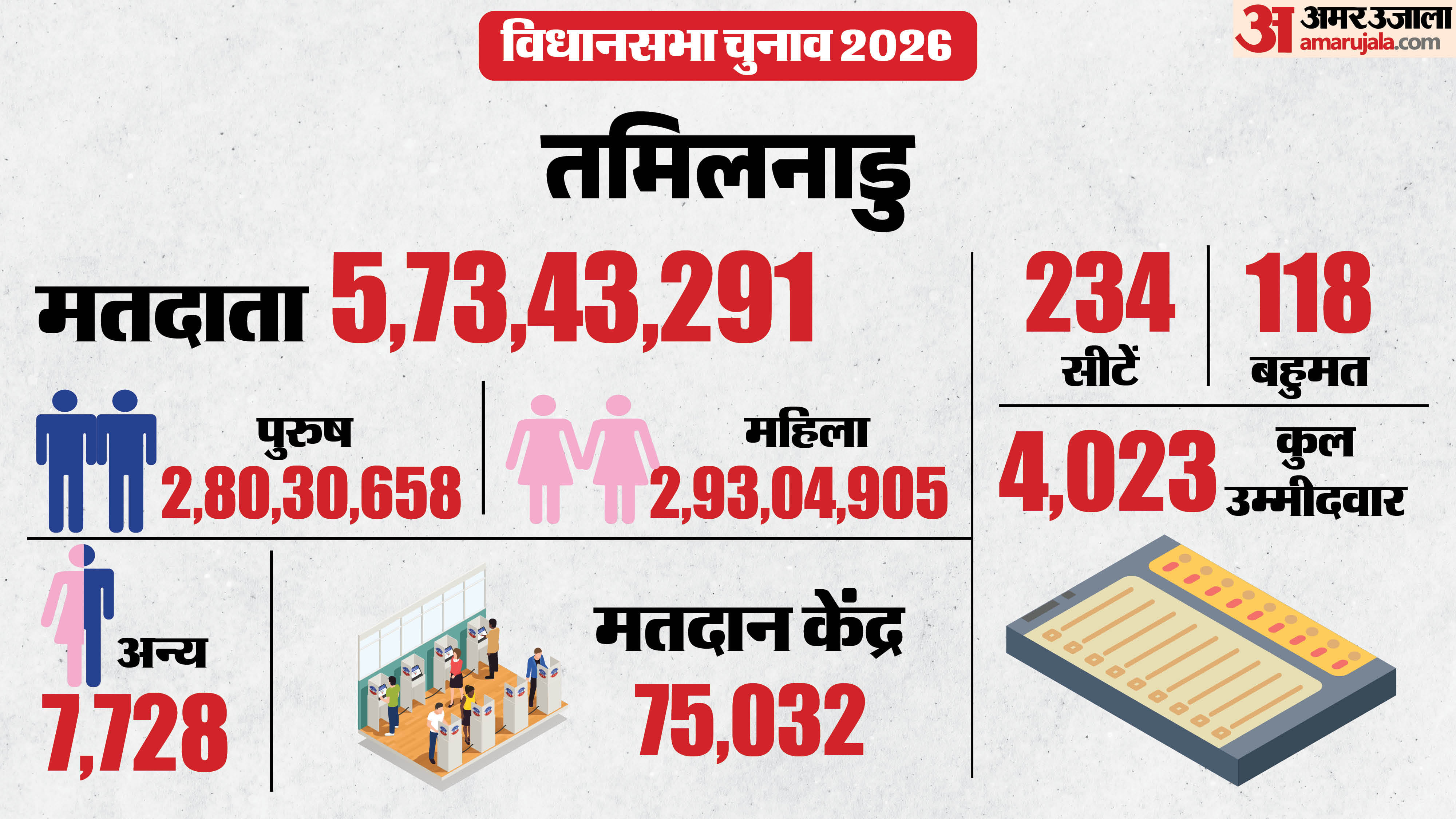 तमिलनाडु में 234 विधानसभा सीटों पर 4,023 उम्मीदवार मैदान में हैं। इनकी किस्मत का फैसला 5.73 करोड़ मतदाता करेंगे। इनमें 2.80 करोड़ पुरुष और 2.93 करोड़ महिला मतदाता हैं। सुचारू रूप से मतदान के लिए 75,032 मतदान केंद्र बनाए गए हैं। 2021 के विधानसभा चुनाव के दौरान राज्य में 73.46% वोटिंग हुई थी। राज्य की कुलिथलई विधानसभा सीट पर 2021 में सबसे ज्यादा मतदान हुआ था। यहां के 87% मतदाताओं ने अपने मताधिकार का प्रयोग किया था। वहीं, विलीवक्कम विधानसभा सीट पर सबसे कम मतदान हुआ था। यहां सिर्फ 56% लोगों ने वोट डाला था।