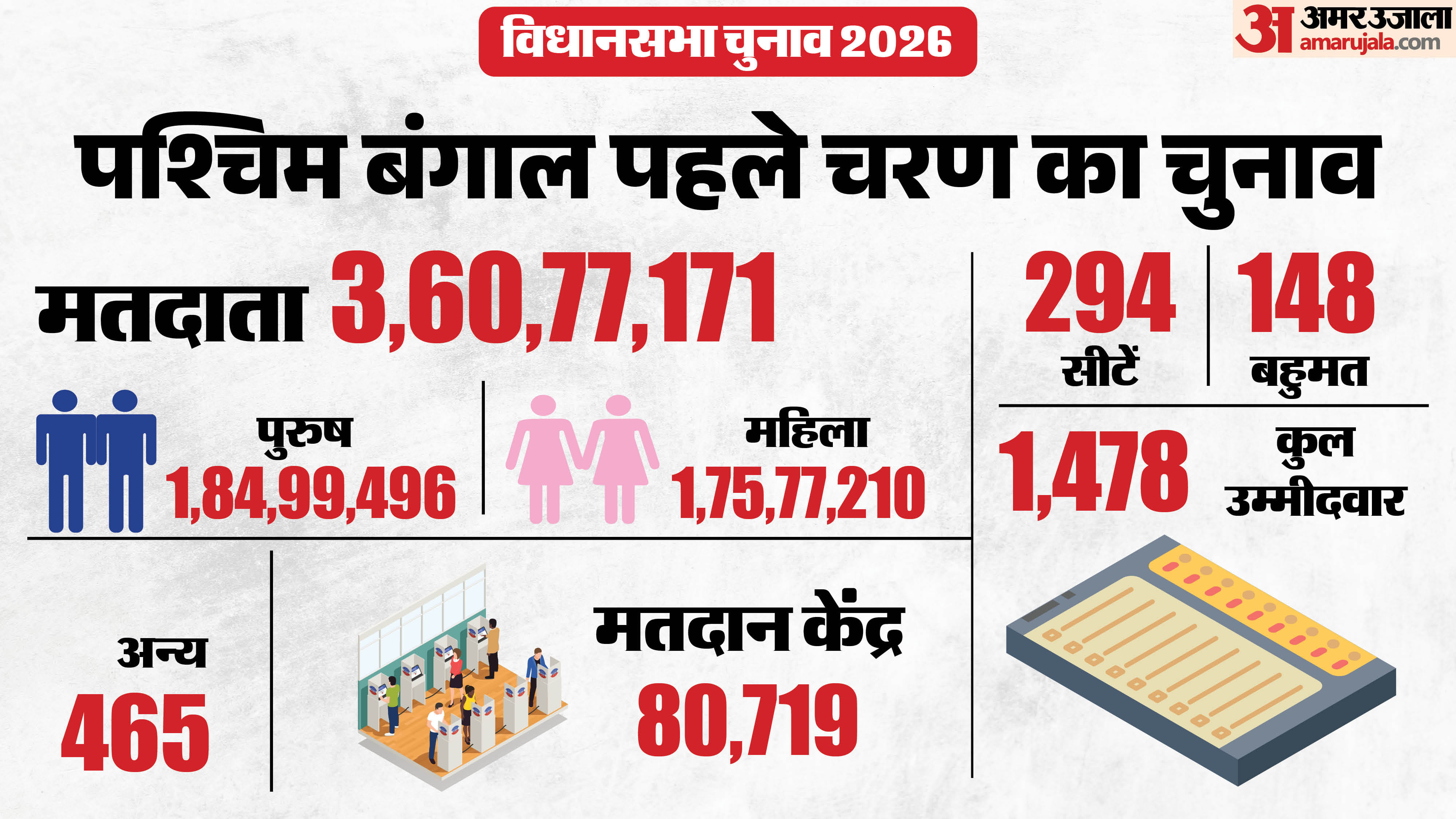 पश्चिम बंगाल में पहले चरण में 152 सीटों पर मतदान है। इन सीटों पर कुल 1478 उम्मीदवार अपनी किस्मत आजमा रहे हैं। इनकी किस्मत का फैसला 3.60 करोड़ मतदाता करेंगे। इनमें 1.84 करोड़ पुरुष और 1.75 करोड़ महिला मतदाता हैं। सुचारू रूप से मतदान के लिए 80 हजार से ज्यादा मतदान केंद्र बनाए गए हैं। 2021 के विधानसभा चुनाव के दौरान राज्य में 83.18% वोटिंग हुई थी। राज्य की कतुलपुर विधानसभा सीट पर 2021 में सबसे ज्यादा मतदान हुआ था। यहां के 91% मतदाताओं ने अपने मताधिकार का प्रयोग किया था। वहीं, कुलटी विधानसभा सीट पर सबसे कम मतदान हुआ था। यहां सिर्फ 69% लोगों ने वोट डाला था।