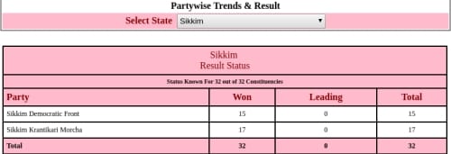 सिक्किम में लंबे समय से ही क्षेत्रीय पार्टियों का दबदबा रहा है। इस बार भी यहां यही नजारा दिखा। लेकिन हैरानी की बात ये रही कि 25 साल से सत्ता में काबिज पवन कुमार चामलिंग की सिक्किम डेमोक्रेटिक फ्रंट पार्टी (एसडीएफ) को हार नसीब हुई। वहीं मुख्य विपक्षी पार्टी सिक्किम क्रांतिकारी मोर्चा (एसकेएम) ने जीत हासिल की है।