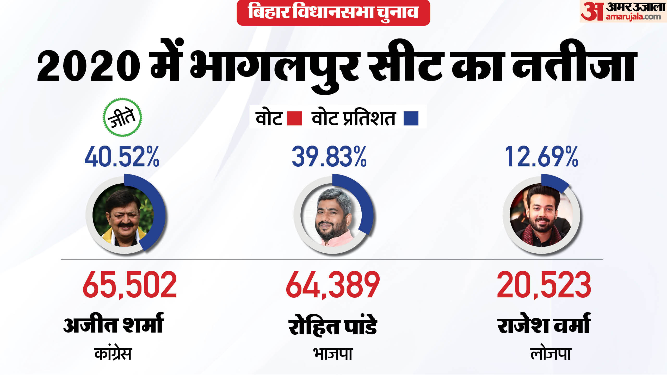 2020 के चुनाव में अजीत शर्मा ने 1,419 वोट से जीत हासिल की। इस चुनाव में उन्हें 65,502 वोट मिले थे। वहीं, भाजपा के रोहित पांडे को 64,389 वोट मिले।