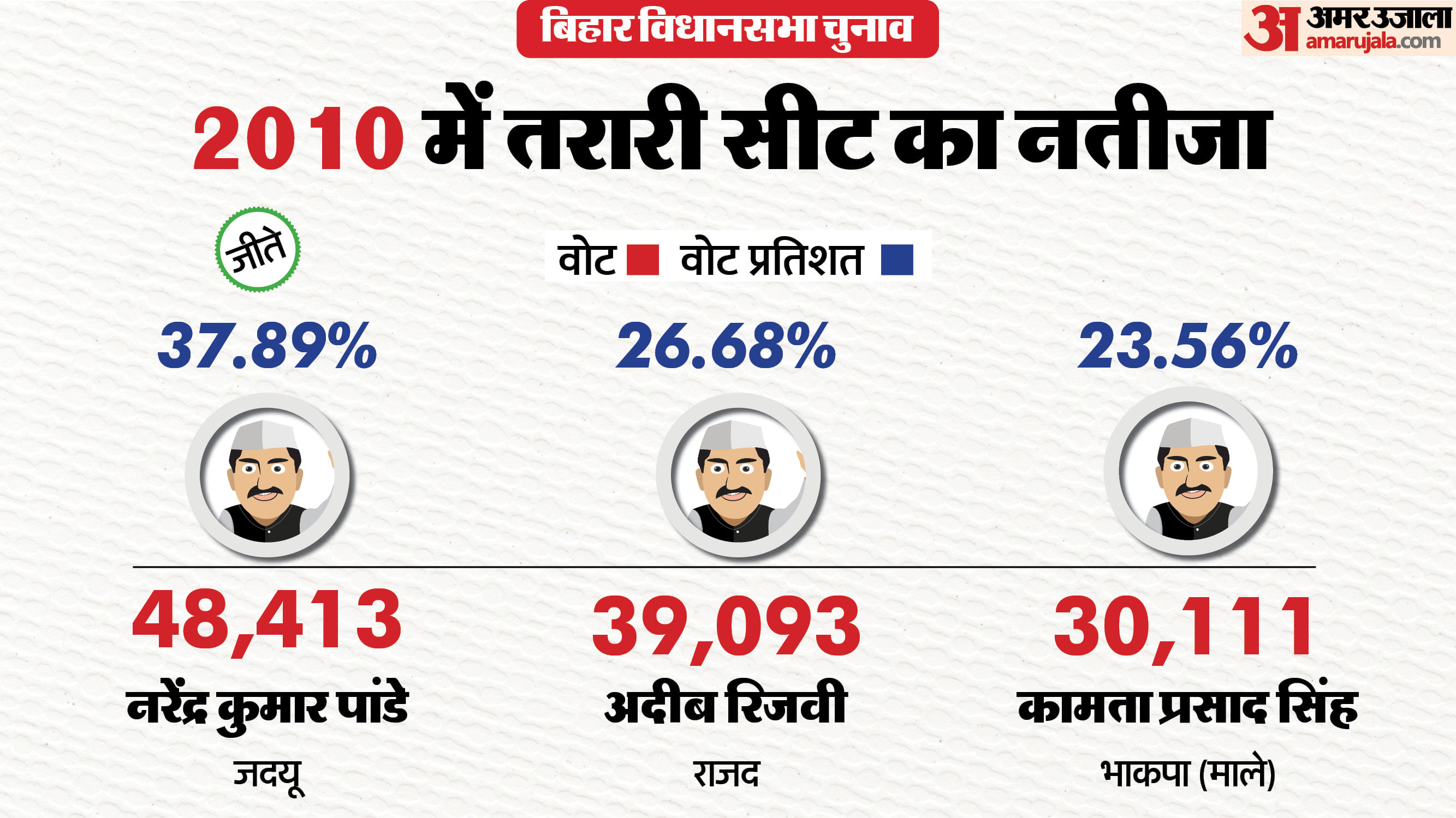 2010 के चुनाव में जदयू के नरेंद्र कुमार को जीत मिली। इस चुनाव में उन्होंने राजद के अदीब रिजवी को 14,320 वोट से हराया। नरेंद्र कुमार को कुल 48,413 वोट मिले। वहीं, अदीब रिजवी को 34,093 वोट मिले।
