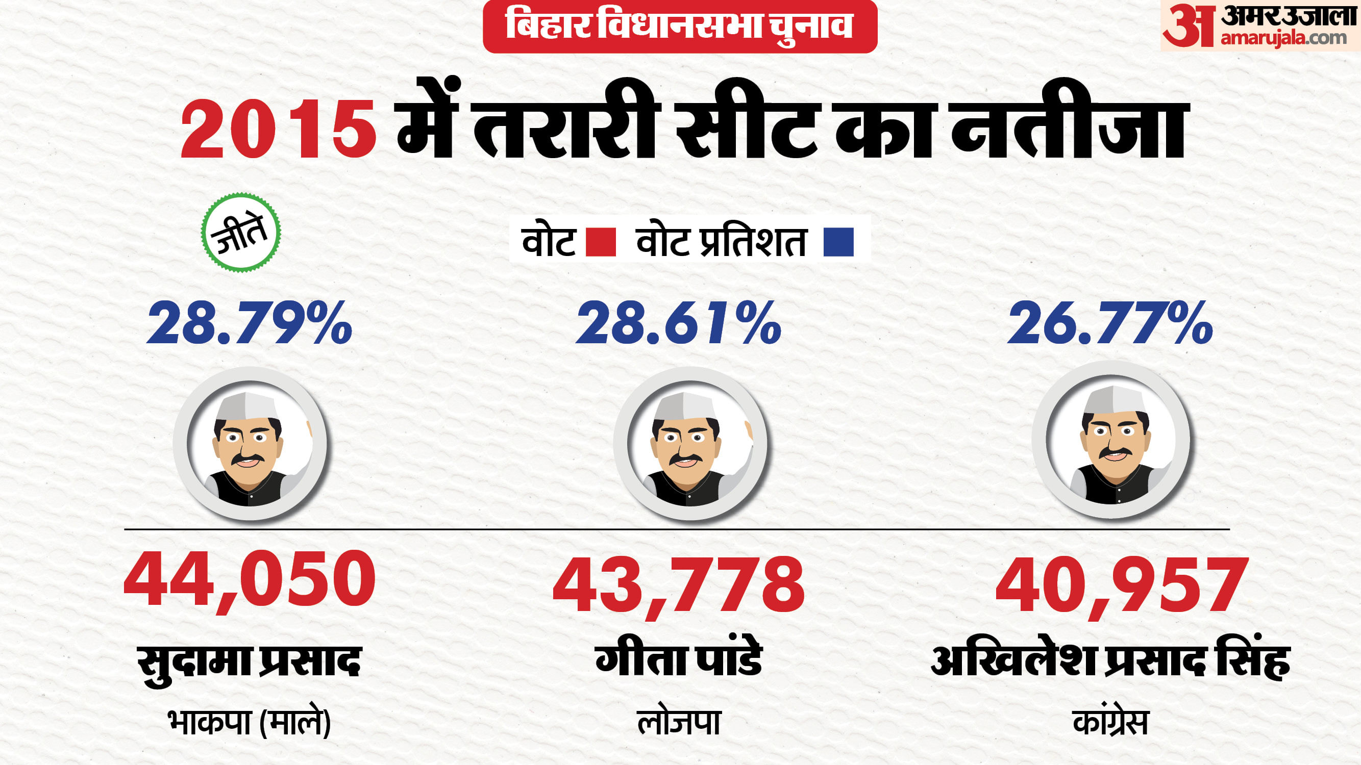 - 2015 में तरारी सीट से भाकपा (माले)के सुदामा प्रसाद को जीत मिली। उन्होंने लोजपा के गीता पांडे को मात्र 272 वोट से हराया। सुदमा प्रसाद को कुल 44,050 वोट मिले। वहीं, गीता पांडे को 43,778 वोट मिले।