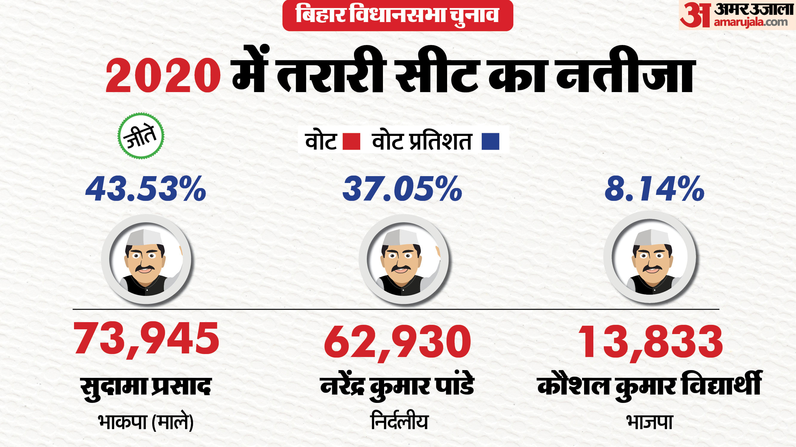 - 2020 के चुनाव में भी भाकपा (माले) के सुदमा प्रसाद को को जीत मिली। इस बार उन्होंने निर्दलीय उम्मीदवार नरेंद्र पांडे को 11,015 वोट से हराया। सुदमा प्रसाद को कुल 73,945 वोट मिले। वही, नरेंद्र पांडे को 62,930 वोट मिले।