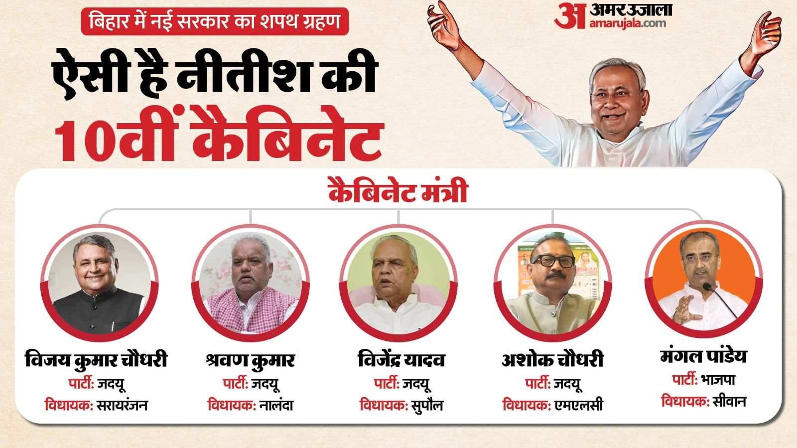 नीतीश कुमार ने रिकॉर्ड 10वीं बार मुख्यमंत्री पद की शपथ ली। साथ ही सम्राट चौधरी और विजय सिन्हा ने शपथ ली। इन तीनों समेत कुल 27 नेताओं ने मंत्री पद की शपथ ली।
