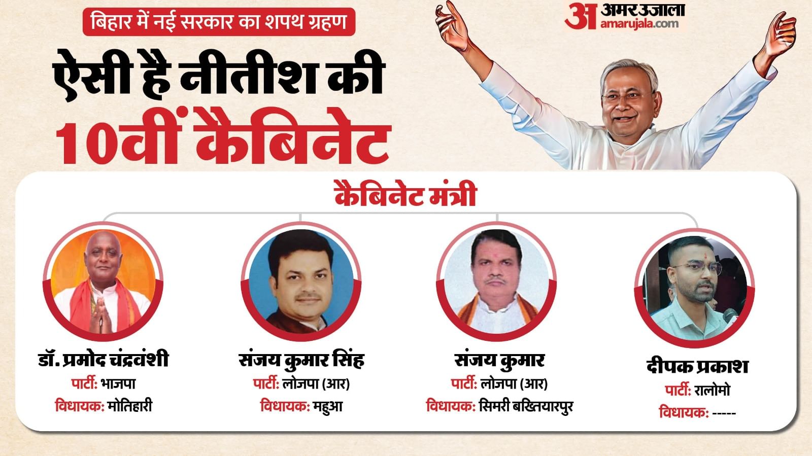 बिहार में नीतीश कुमार ने 10वीं बार मुख्यमंत्री पद की शपथ ली है। उनके साथ 26 अन्य मंत्रियों ने भी शपथ ली। इनमें भाजपा के कोटे से 14 मंत्री, जदयू के कोटे से 8 मंत्रियों को जगह मिली है। वहीं, चिराग पासवान की लोजपा (रामविलास) को दो मंत्री पद मिले हैं। जीतनराम मांझी की हम पार्टी को एक मंत्री पद और उपेंद्र कुशवाहा की राष्ट्रीय लोक मोर्चा (रालोमो) को भी एक मंत्री पद मिला है।