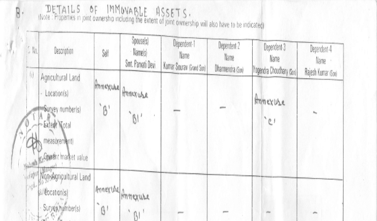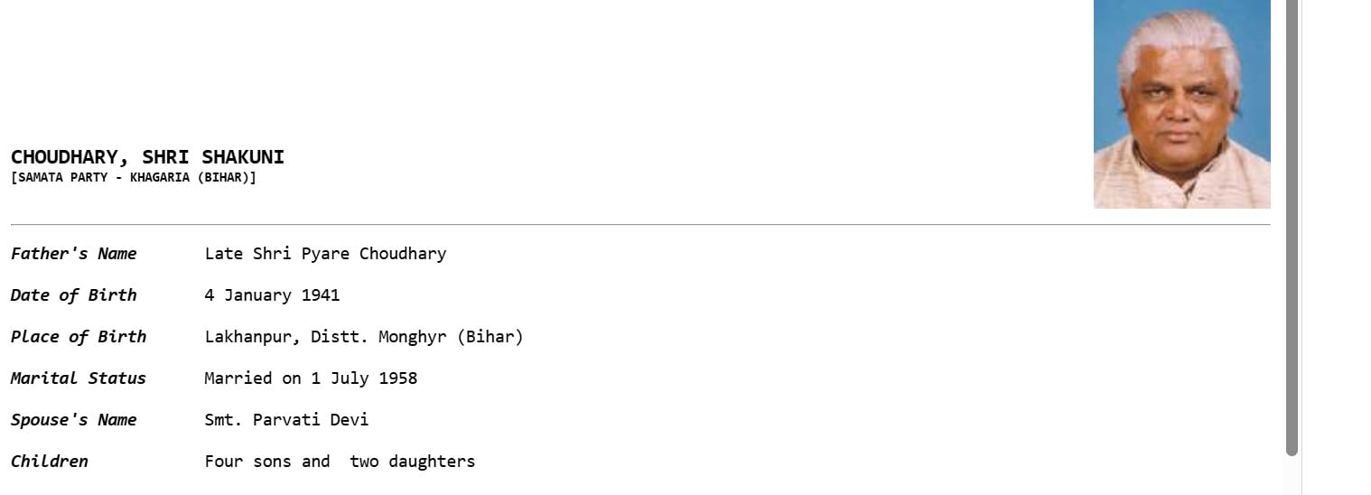 (ii). शकुनी चौधरी के 2005 के चुनावी हलफनामे में दी गई जानकारी के मुताबिक, उन पर आश्रित चार लोग थे, जिनमें तीन बेटे और एक पोता था। इस हलफनामे में उन्होंने अपने बेटों के नाम- धर्मेंद्र, योगेंद्र और राजेश बताए हैं। वहीं, पोते का नाम कुमार सौरव बताया गया है। इस हलफनामे में सम्राट चौधरी जो राकेश कुमार ने नाम से भी जाने जाते हैं उनके नाम का जिक्र नहीं है।