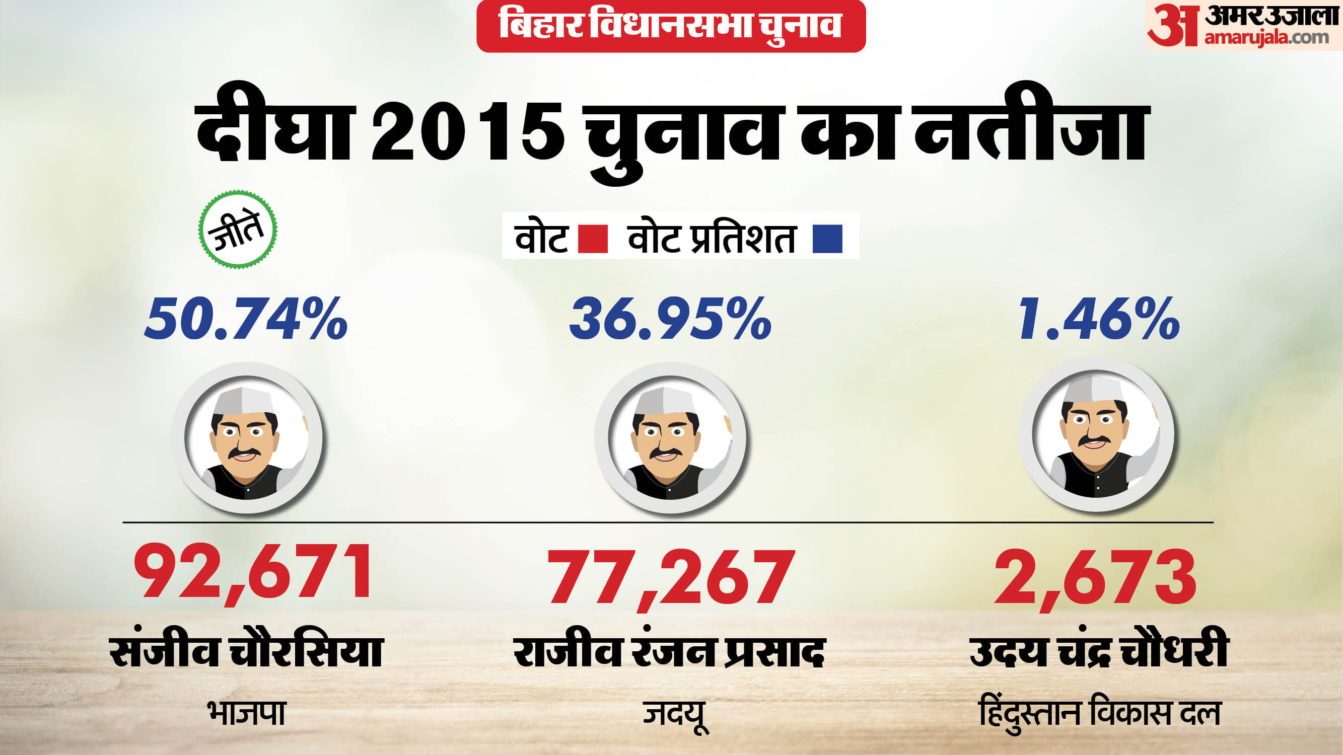 • 2015 के विधानसभा चुनाव में दीघा सीट से भाजपा के संजीव चौरसिया को जीत मिली थी। उन्होंने जदयू के राजीव रंजन प्रसाद को 24,779 वोट से मात दी। संजीव चौरसिया को कुल 92,671 वोट मिले। वहीं, राजीव रंजन प्रसाद को 67,892 वोट से संतोष करना पड़ा।