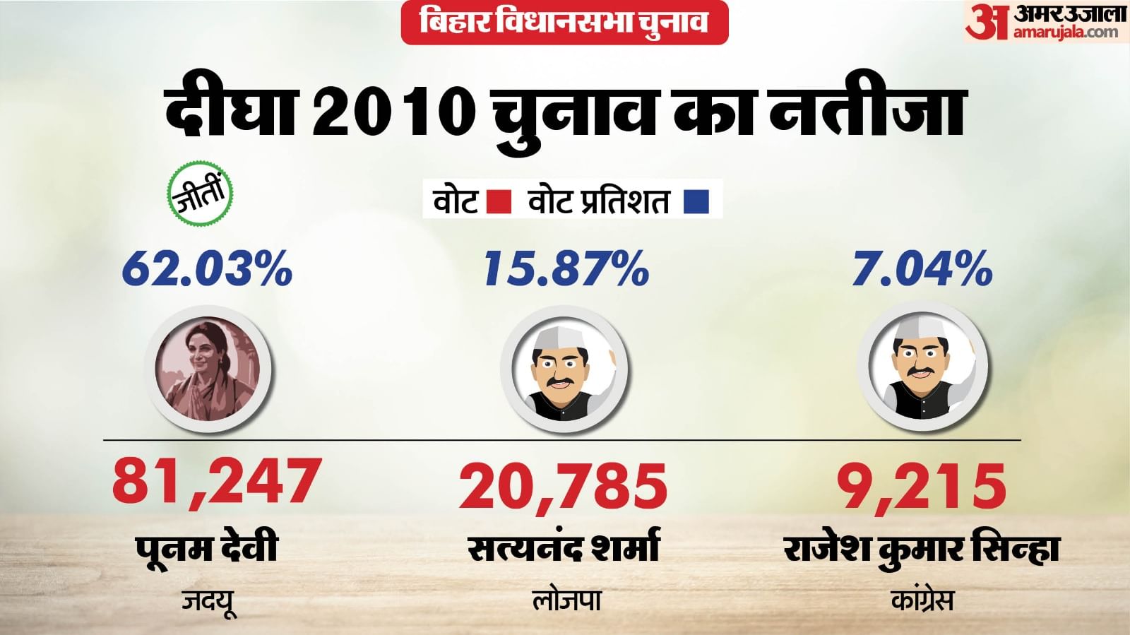 2010 के चुनाव में दीघा सीट से जदयू की पूनम देवी को जीत मिली। इस चुनाव में उन्होंने लोजपा के सत्या नंद शर्मा को 60,462 वोट से हराया था। पूनम देवी को कुल 81,247 वोट मिले। वहीं, सत्यानंद शर्मा को 20,785 वोट मिले।