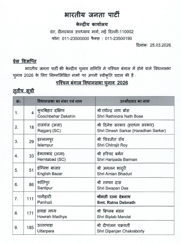 भारतीय जनता पार्टी ने पश्चिम बंगाल विधानसभा चुनावों के लिए उम्मीदवारों की तीसरी सूची बुधवार शाम को जारी कर दी। तीसरी सूची में भाजपा ने 19 उम्मीदवारों के नामों का एलान किया है। पार्टी ने पूर्व एनएसजी कमांडो और आरजी कर रेप पीड़िता की मां को भी चुनावी मौदान में उतारा है। इससे पहले भाजपा ने पश्चिम बंगाल विधानसभा चुनाव के लिए पहली सूची में 144 और दूसरी सूची में 111 उम्मीदवारों के नामों का एलान किया था। इसमें निसिथ प्रमाणिक, प्रियंका टिबरेवाल और रूपा गांगुली जैसे प्रमुख नाम शामिल थे। पार्टी अभी तक 274 उम्मीदवारों के नामों का एलान कर चुकी है।